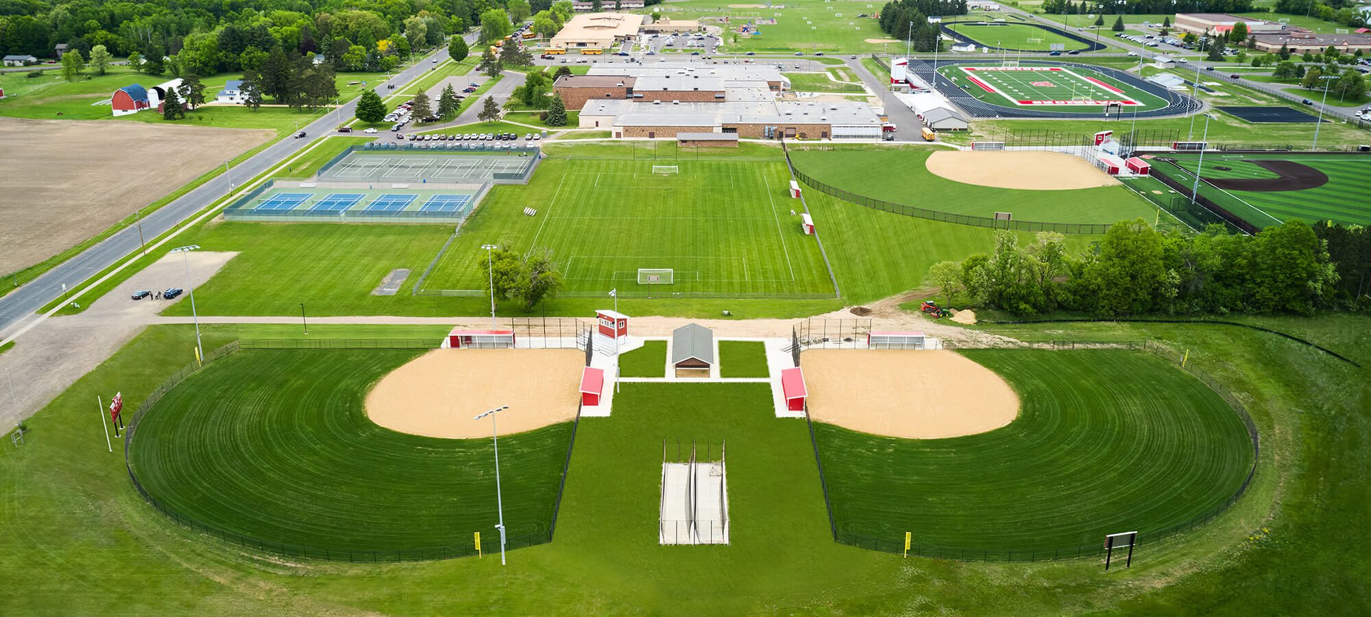 A new varsity field with artificial turf and a junior varsity field were added, along with lighting, scoreboards, batting cages, pitching mounds, bleachers, and a shared press box.