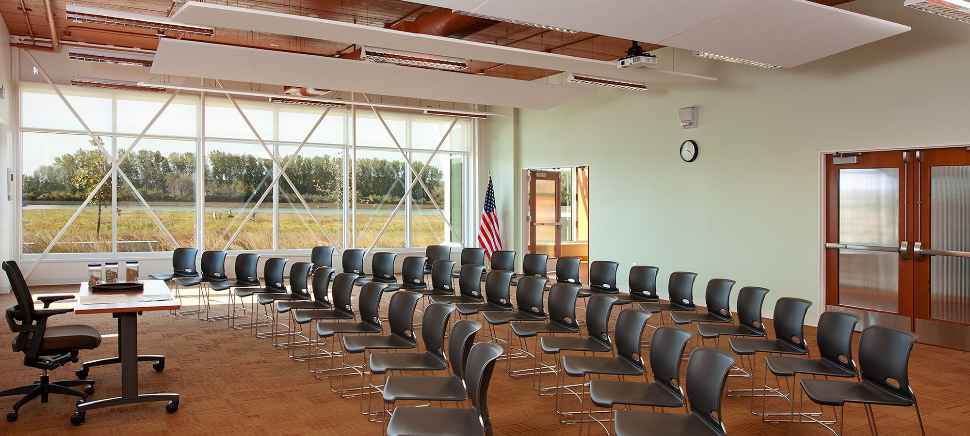 The center features a reception area, exhibit spaces, a large classroom, a science lab, a conference room, and offices for educators. Its strategic placement nestles the building into the landscape, framing views of restored wetlands and a naturalized lake. Surrounding the facility are 20+ acres of restored native wetlands, a lake, outdoor learning stations, native gardens, and nature trails.