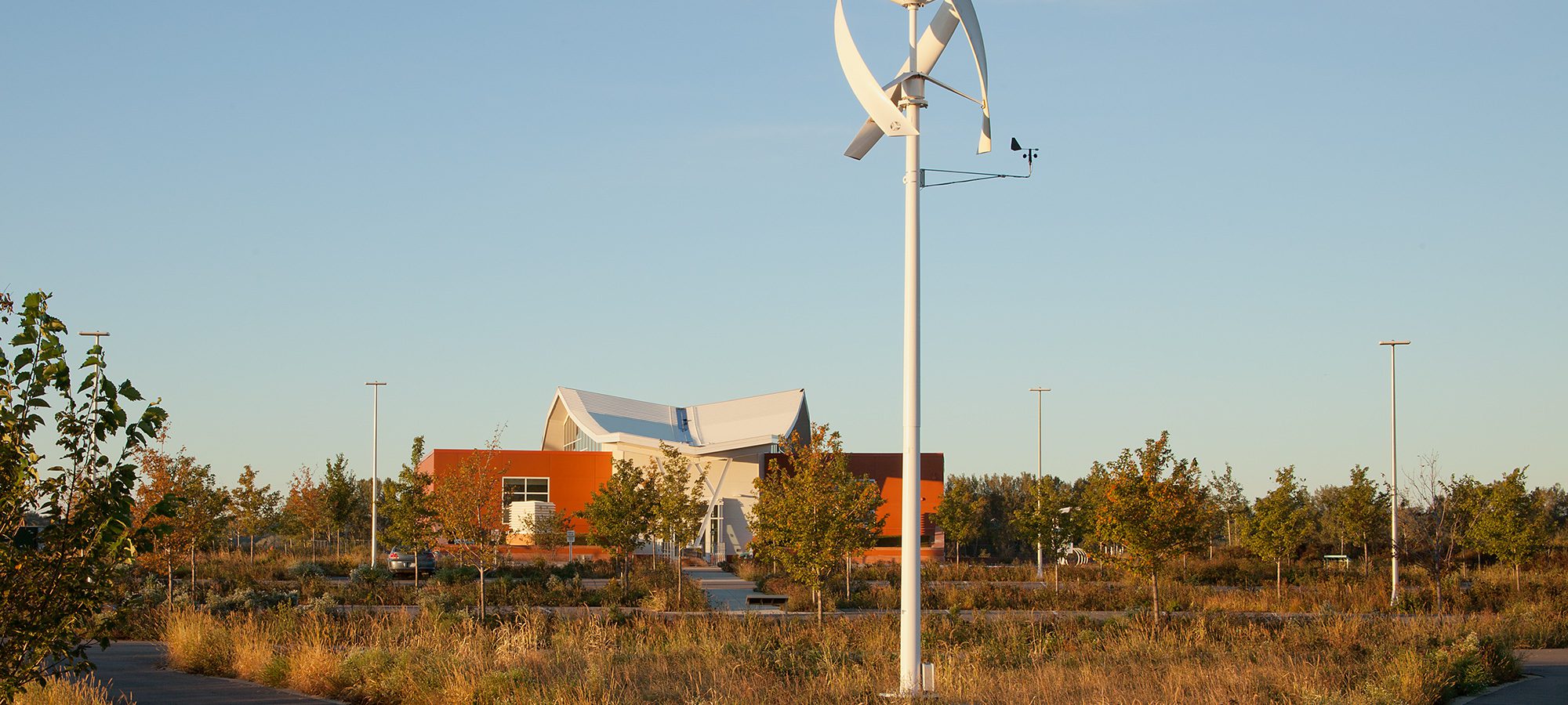 Intensive green roofs flank the entry, offering beauty and stormwater management by mimicking nature with engineered soils and plants that retain and release water gradually. Native plantings dominate the site, including restored short-grass prairie and wetlands. Around the building, prairie gardens and hybrid native trees showcase evolving plant science and sustainable landscaping principles.